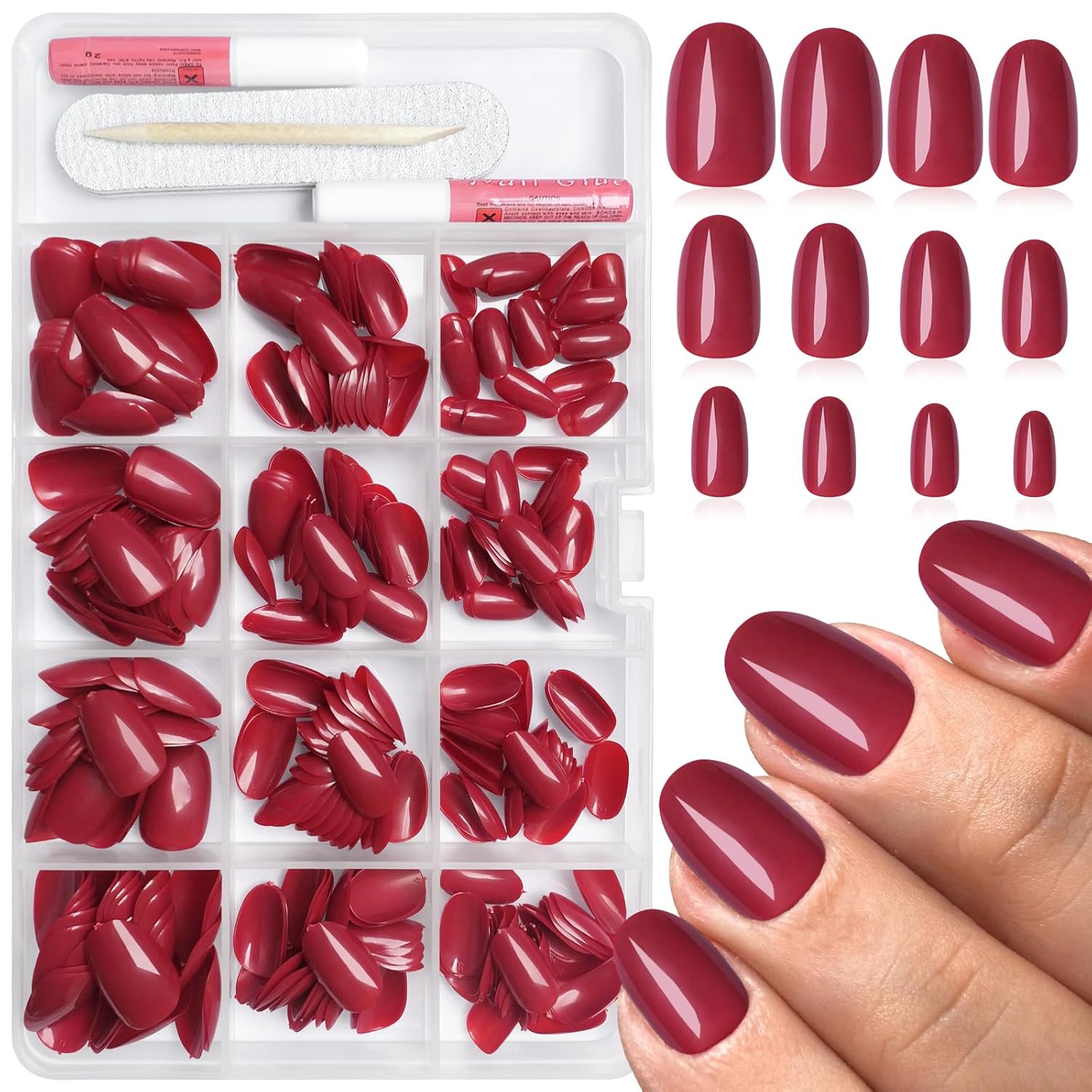 - Oval press on nails short kit: come with 360pcs press on oval nails hot pink for women girls teens diy false nail. 2*nail glue. 5 nail adhesive tabs. 1 nail file and 1 wooden stick. No need to buy additional materials. you can achieve the elegant press nail salon effect at home in minutes. Perfect for everyday trips to the beach. save your money and time